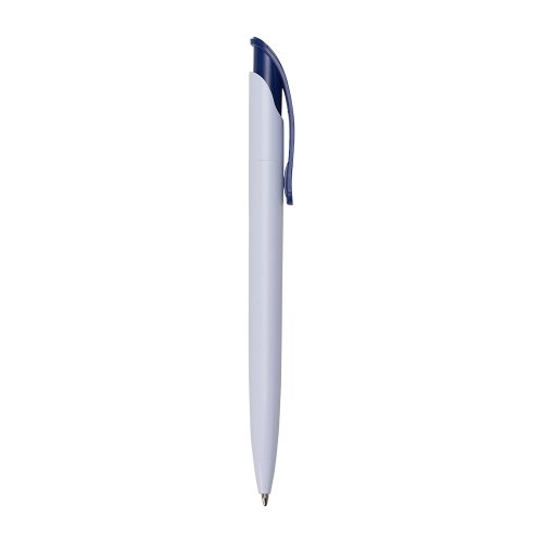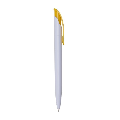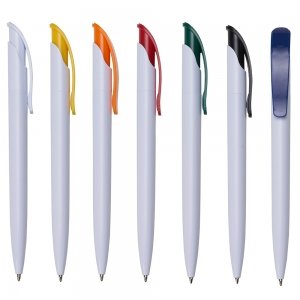 Caneta plástica branca com clip colorido. Aciona por clique.