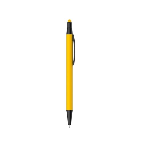 Caneta metal touch com pintura fosca colorida. Clip, acionador e ponteira em preto, possui borracha touch no acionador.