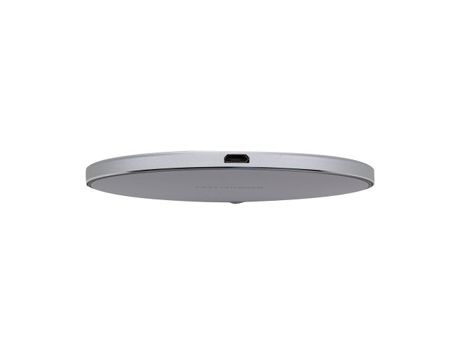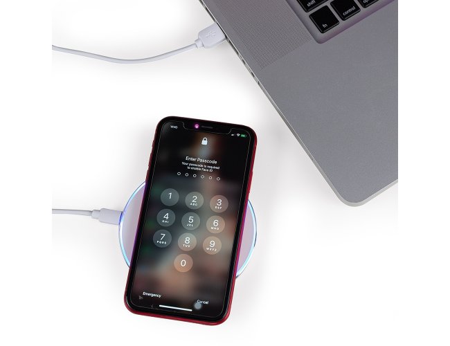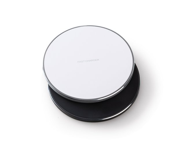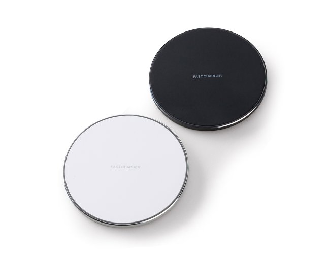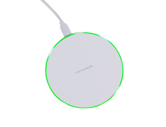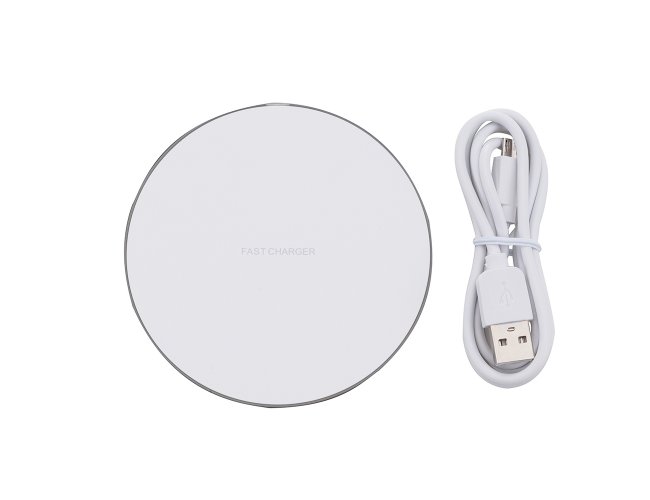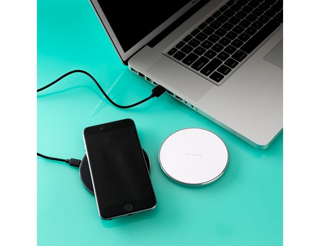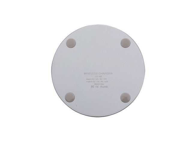 Carregador wireless por indução em formato de disco. Produzido em material plástico, o carregador possui antiderrapantes de silicone na parte inferior. Para desfrutar do carregamento por indução (sem fio) desta maneira é possível carregar o celular posicionando-o sob carregador, sendo necessário apenas necessário conectar o carregador à uma fonte de energia (USB ou diretamente na tomada).