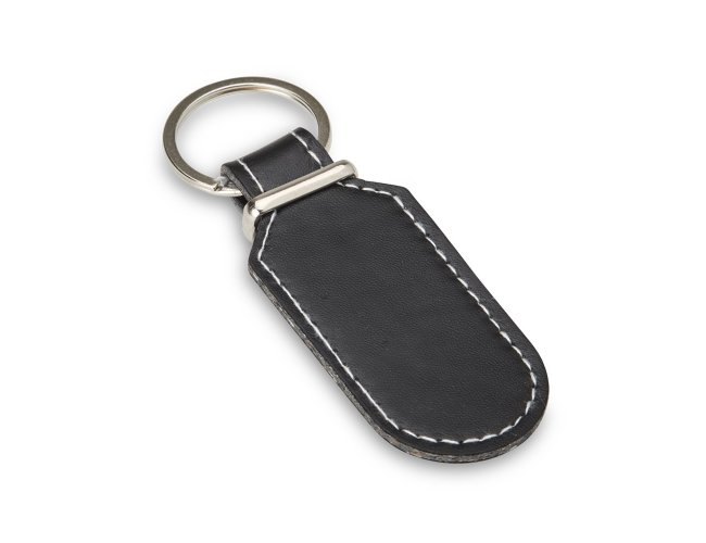 Chaveiro de couro sintético com detalhe em metal e frente e verso lisos.