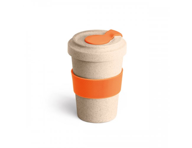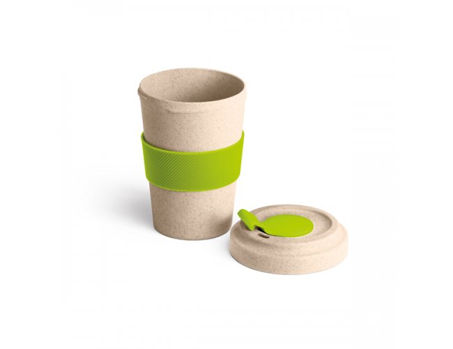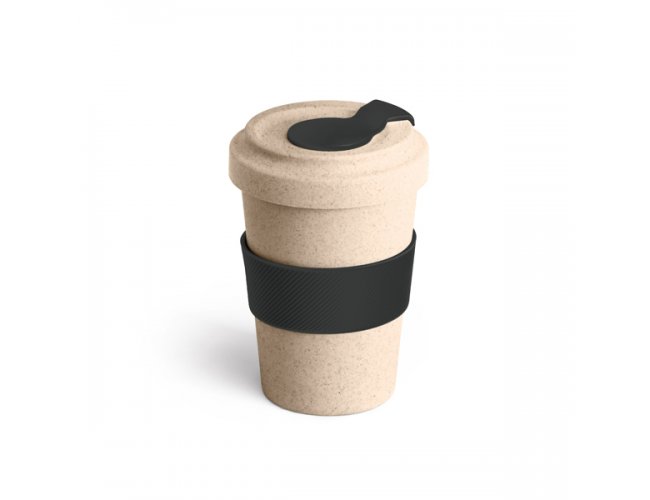 Copo para viagem. Fibra de bambu e PP. Com banda de silicone e tampa. Capacidade até 500 ml.