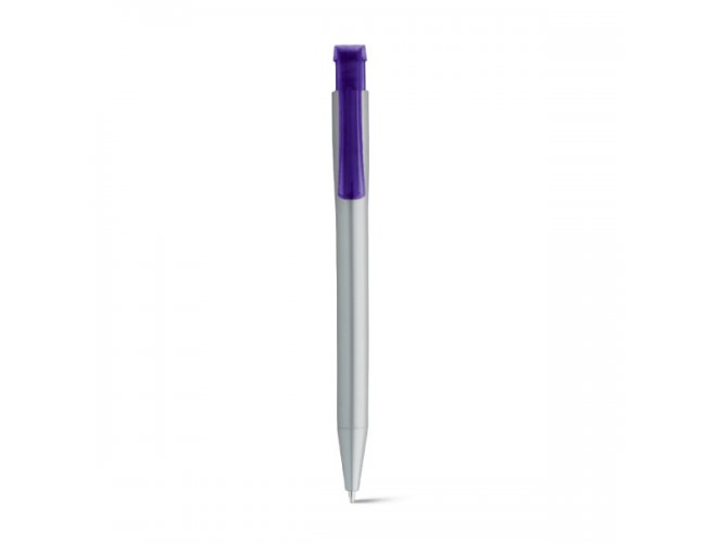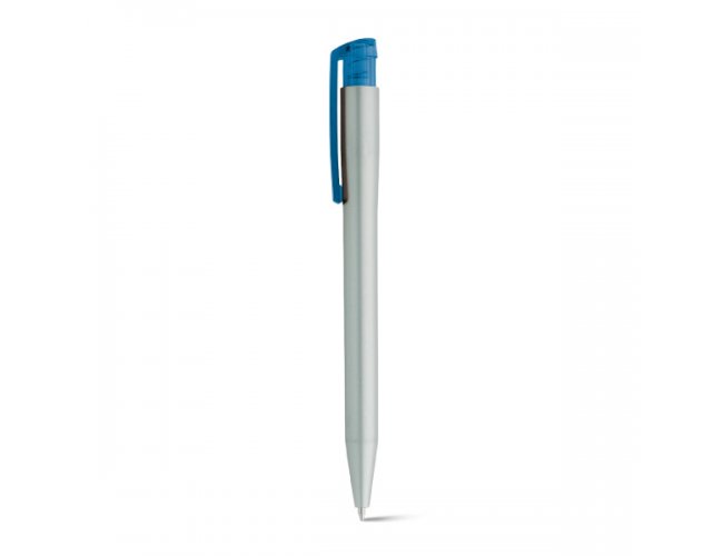 Esferográfica em ABS com acabamento metalizado e clipe translúcido colorido. Até 1,5 km de escrita. ø11 x 136 mm