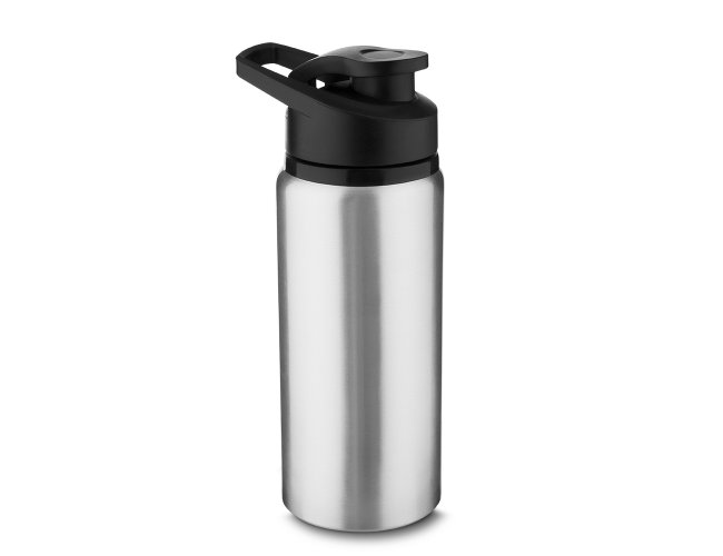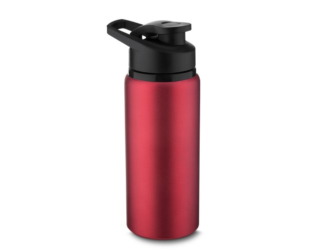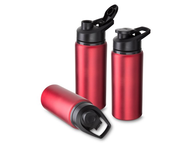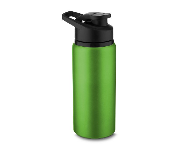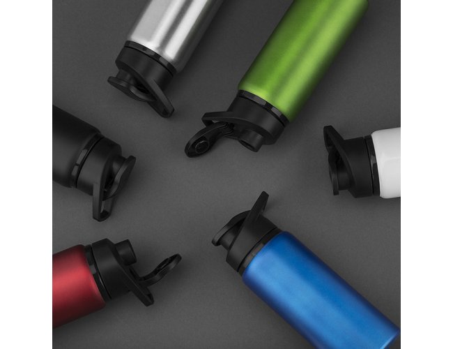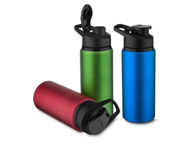 Garrafa de alumínio com capacidade de até 650ml em cores. Tampa rosqueável, bico com tampa vedada de acesso rápido, e alça para transporte.
