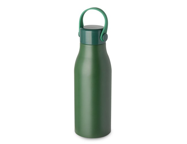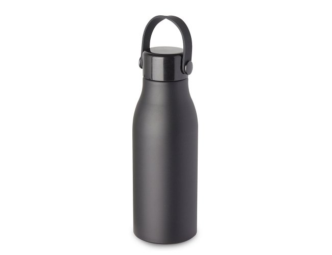 Garrafa em alumínio, tampa em plástico com alça na cor do produto. Capacidade de 550ml, pintura fosca.
