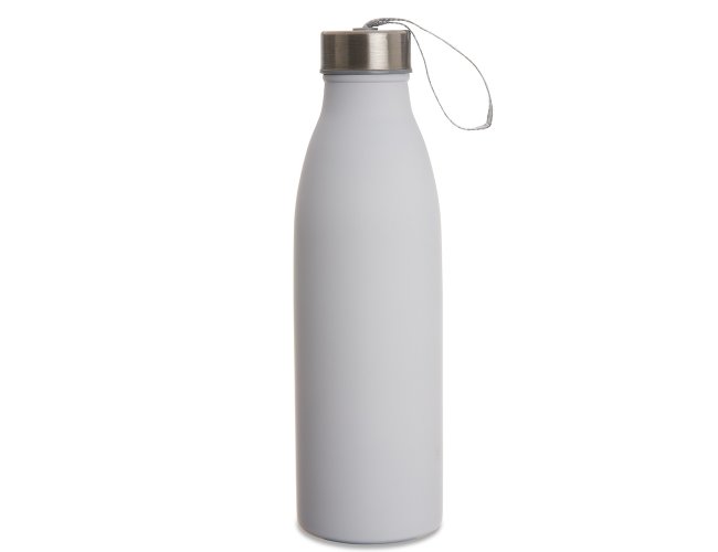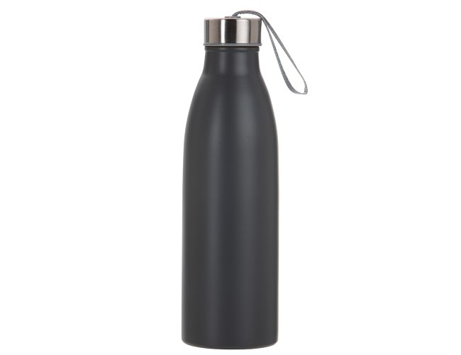 Garrafa de inox 750ml com tampa rosqueável e alça de nylon embutida.