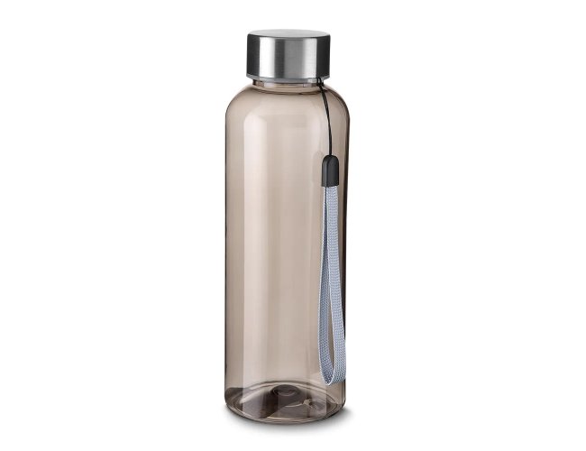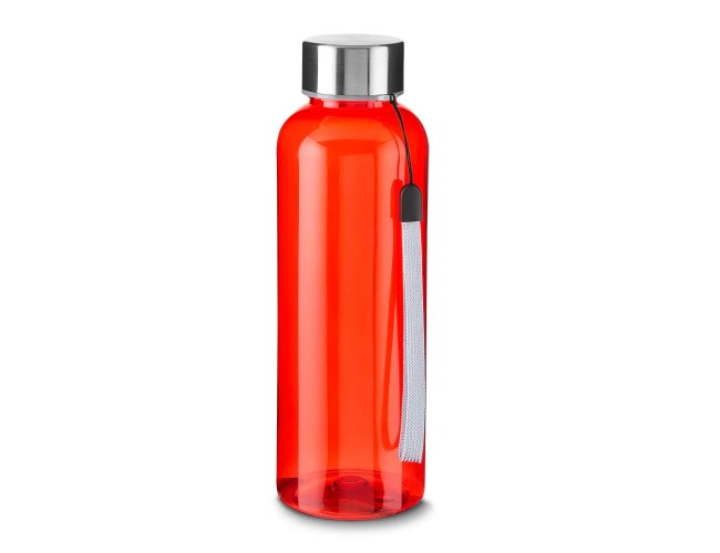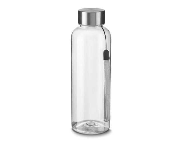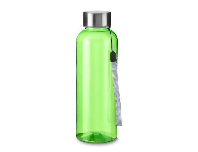 Garrafa plástica 500 ml feita em material PET reciclado. Tampa de metal rosqueável com cordão.