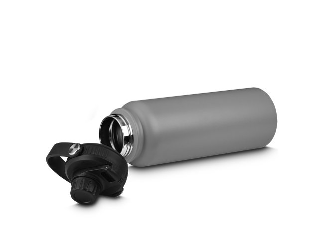 Garrafa térmica em aço inox com parede dupla com capacidade de 1,1L, tampa rosqueável com alça plástica e anel de silicone para vedação.