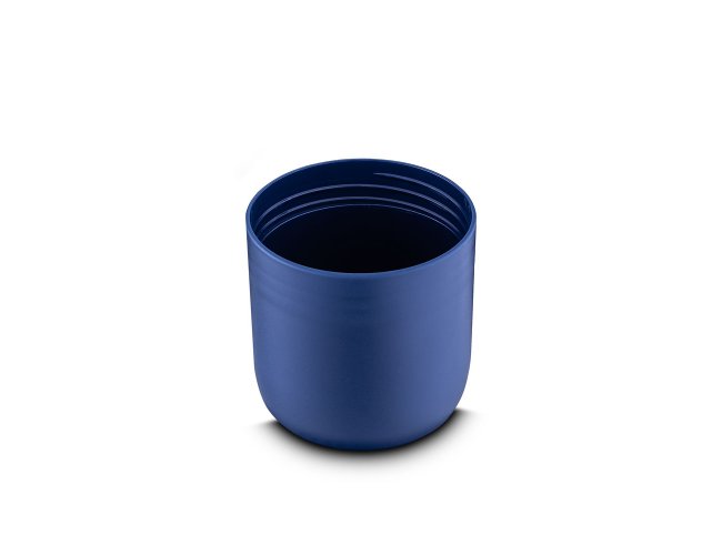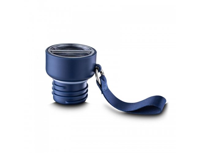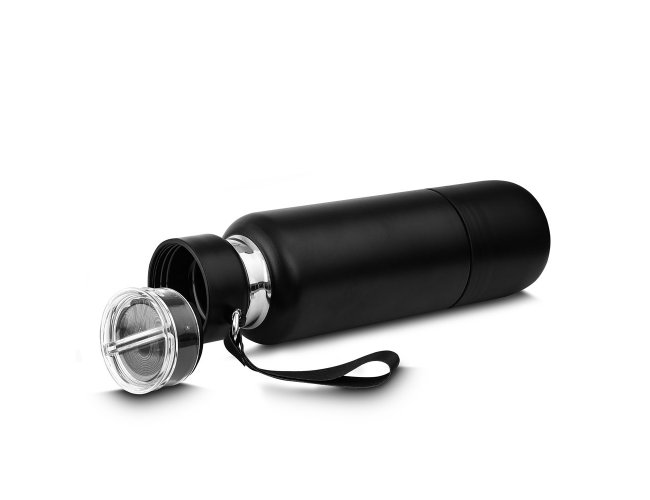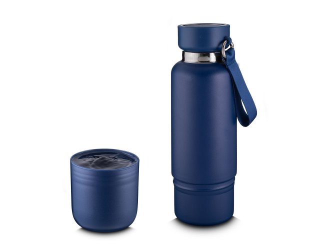 Garrafa térmica em aço inox com parede dupla isolada a vácuo e capacidade de 500ml. Alça de transporte em cordão. Tampa rosqueável, vedada por um anel de silicone e com uma argola tipo mosquetão para o cordão. Parte superior da tampa possui um compartimento para pequenos objetos que acompanha um cordão adicional de 68cm para substituição e cordão de mão com 10cm. Possui copo adicional rosqueável na parte inferior da garrafa de 250ml. Pintura fosca.