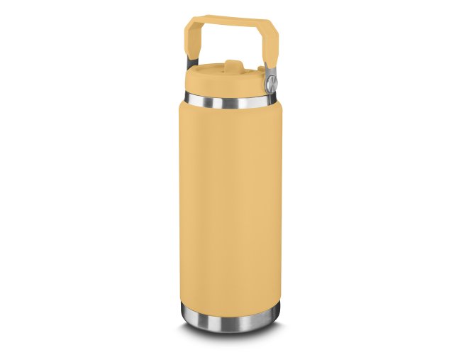 Garrafa térmica em aço inox com parede dupla com capacidade de até 900ml. Tampa rosqueável com anel de silicone para vedação. Alça de transporte em plástico. Permite-se hidratar pelo bico, com canudo. Pintura a pó.