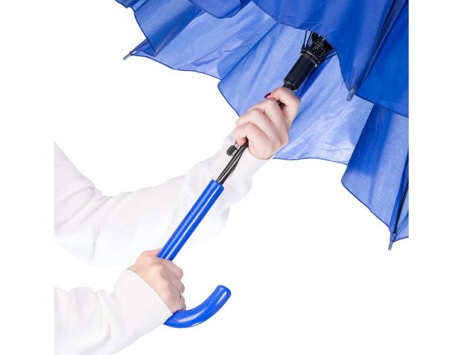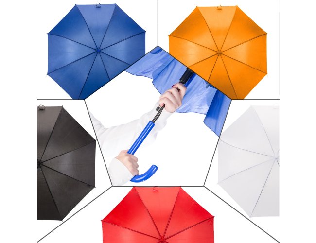 Guarda-chuva colorido com tecido de nylon e abertura automática, basta acionar o botão inferior. Personalizado com a sua logomarca. Possui 8 varetas pretas de aço, pegador e bico superior de plástico.