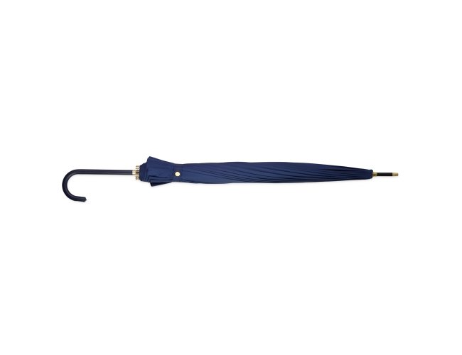 Guarda-chuva de poliéster com abertura automática, estrutura em aço e 16 varetas em fibra de vidro. Possui pegador em couro sintético com botão de acionamento.