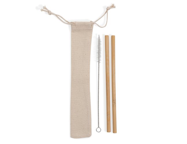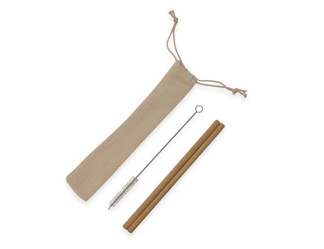 Kit contendo 2 canudos de bambu e uma escova limpadora. Embalagem em algodão reciclado.