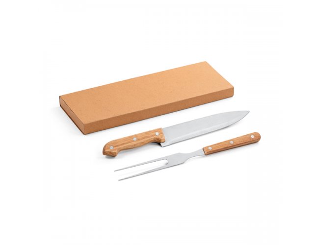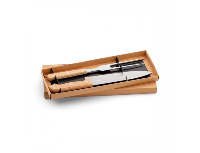 Kit churrasco. Aço inox e bambu. 2 peças em caixa kraft. Food grade.