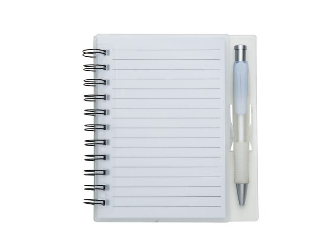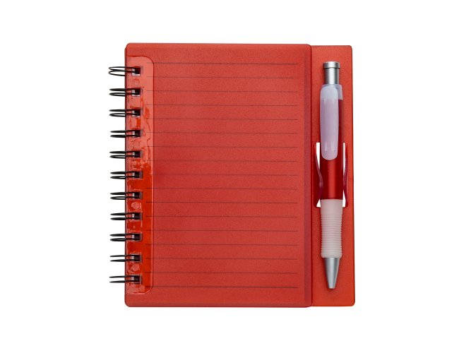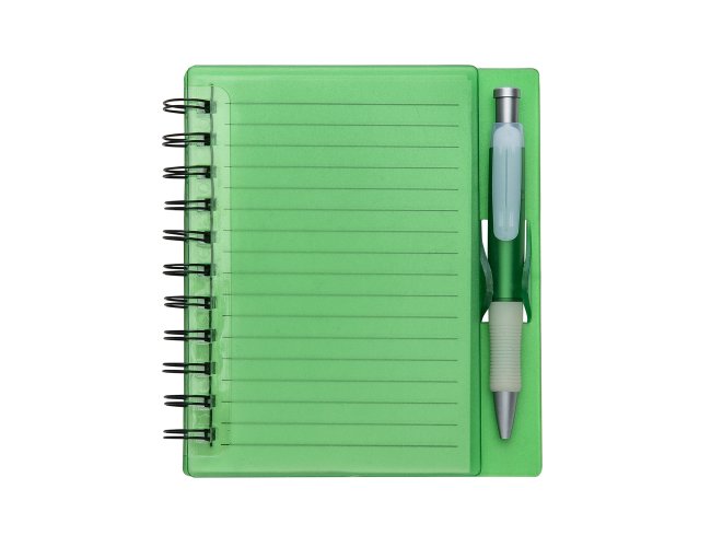 Bloco de anotações acrílico colorido com wire-o e caneta plástica. Possui aproximadamente 70 folhas brancas pautadas, caneta plástica colorida com detalhes em branco(acionador e ponteira prata). observação: Bloco 16,1 cm x 14,8 cm – Caneta 13,4 cm x 1,7 cm
