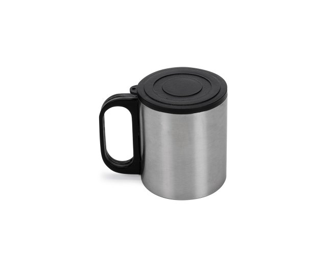 Caneca de inox 180ml com cabo e tampa em plástico resistente(não é térmica).