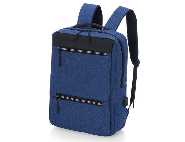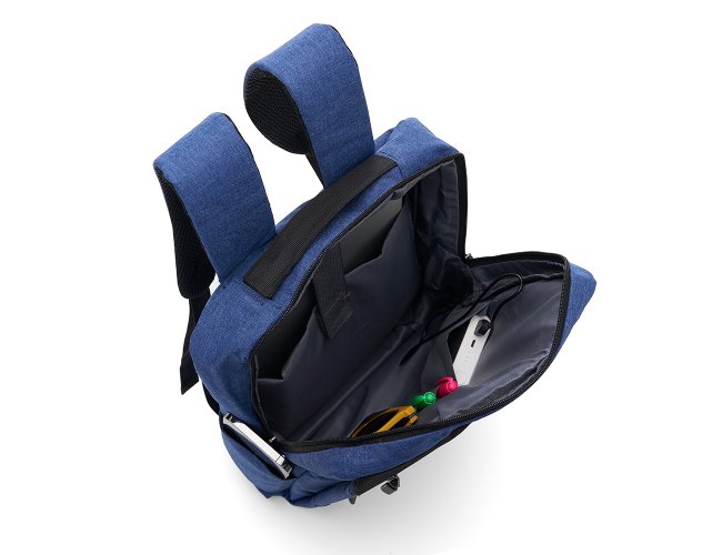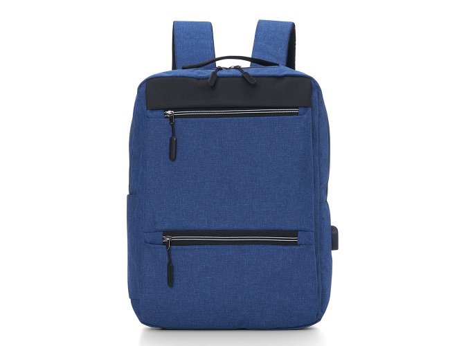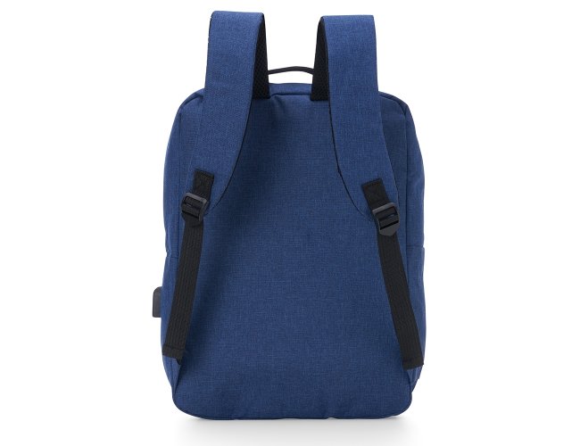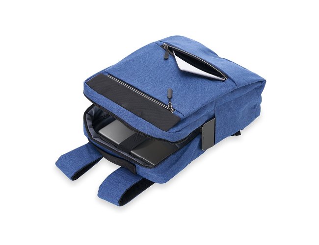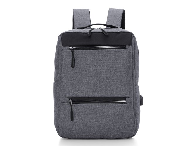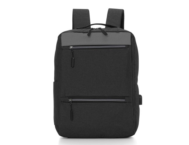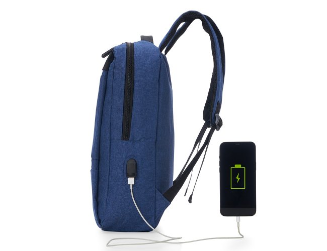 Mochila confeccionada em nylon com compartimento para notebook até 15,6 polegadas. Contém compartimento grande com divisórias para documentos, eletrônicos e caneta, dois compartimentos frontais com abertura horizontal, bolso lateral e adaptador USB externo com cabo acoplado, permitindo a conexão de um carregador portátil de dentro da mochila e transferência da carga para o lado externo, ocultando o carregador e viabilizando a utilização do celular durante o processo. Contém zíperes com pegadores plásticos, alça de mão em nylon e alças para as costas ajustáveis com revestimento espumado antitranspirante.