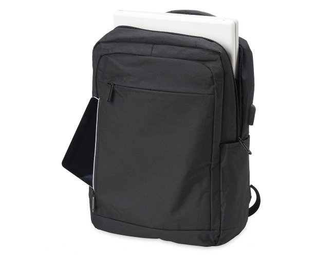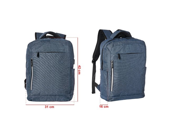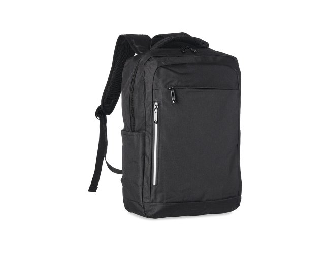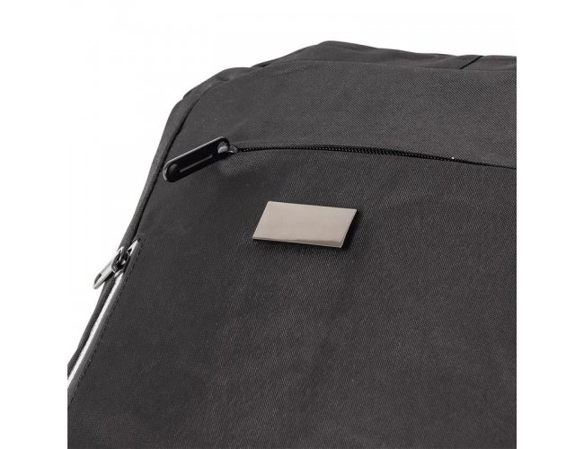 Mochila de nylon 20 litros com três compartimentos, sendo o principal com bolso para notebook 15,6. Com bolsos laterais e faixa frontal refletiva, a mochila possui adaptador USB externo, alça para encaixe em malas de viagem, duas alças de mãos e alças para as costas com revestimento espumado. Acompanha plaquinha metálica.