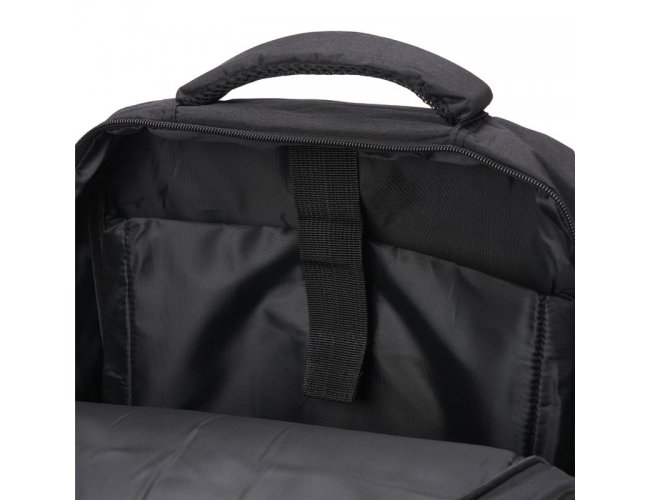 Mochila de nylon 20 litros com três compartimentos, sendo o principal com bolso para notebook 15,6. Com bolsos laterais e faixa frontal refletiva, a mochila possui adaptador USB externo, alça para encaixe em malas de viagem, duas alças de mãos e alças para as costas com revestimento espumado.