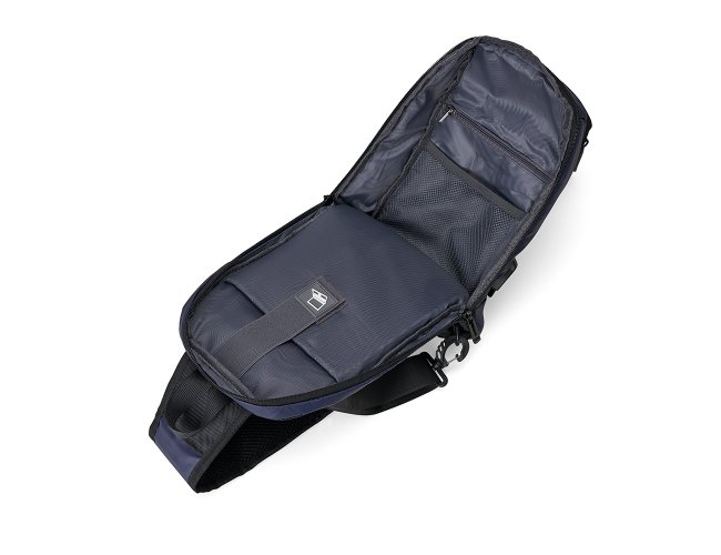 Mochila de ombro com entrada USB lateral. A mochila possui 3 bolsos frontais 1 compartimento principal e 1 bolso traseiro, sendo 1 bolso frontal com detalhe refletivo no zíper, além de 3 compartimentos internos, sendo 1 para armazenar tablet, netbook ou Ipad de até 9 polegadas. Alça com tira de nylon, 2 fivelas para opção de encaixe, parte traseira com revestimento espumado antitranspirante, e alça de mão em nylon.