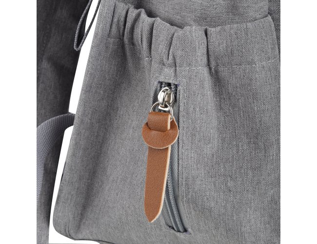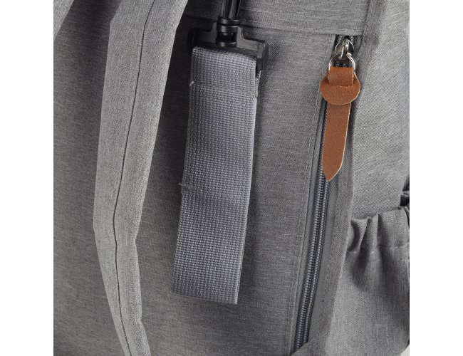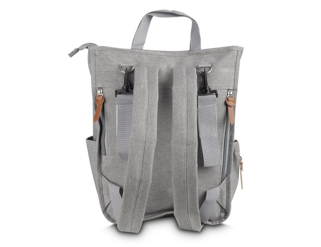 Mochila Multifuncional em poliéster 300D com detalhes em PU e interior em 210D. Possui alça de mão, alça para ombro e engate para carrinho de bebê. Conta com 2 bolsos laterais, 2 frontais com zíper e 2 compartimentos traseiros com zíper. O interior inclui divisórias, uma delas térmica, e uma divisória com zíper. Prática e versátil