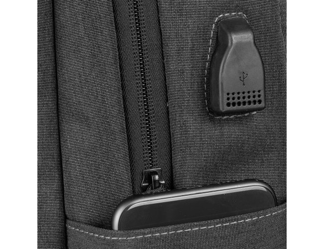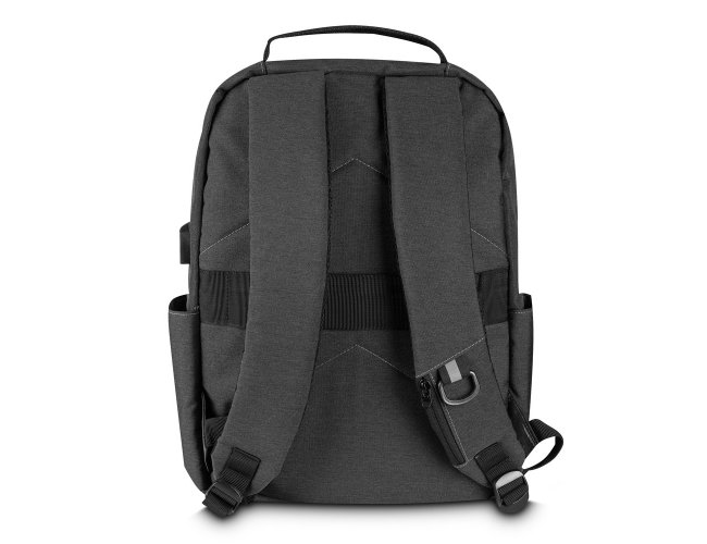 Mochila produzida em tecido de poliéster e PU, alça de ombro acolchoada, bolsos frontais com zíper,dois compartimentos laterais, aceita notebooks de até 15,6”. Alça de ombro ajustável, porta USB na lateral da mochila, compartimento com zíper na alça de ombro para pequenos objetos.