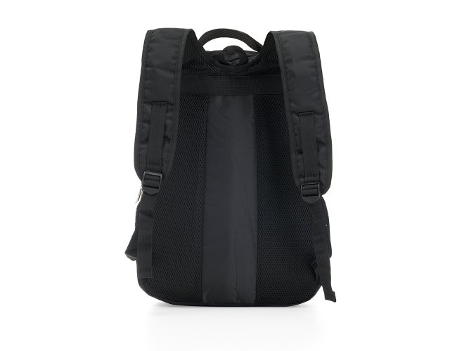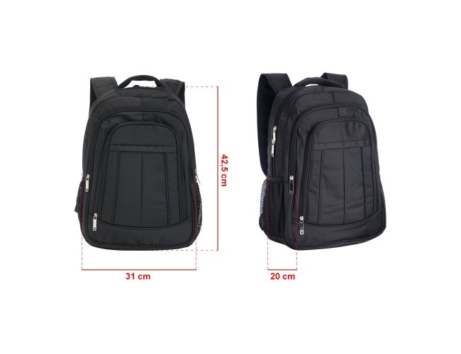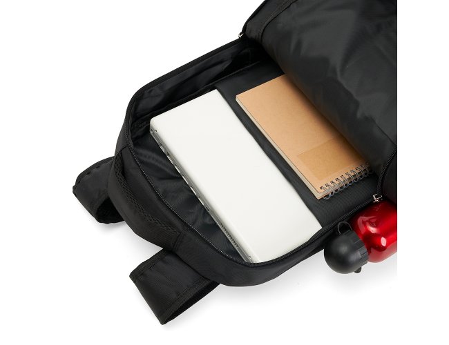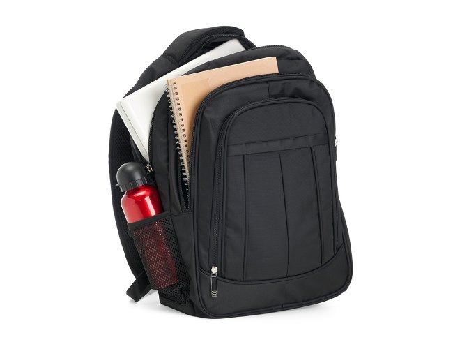 Mochila de poliéster 26 litros com três compartimentos, sendo o principal com bolso para notebook 156. A mochila possui bolsos laterais em malha, duas alças de mãos e área costada com revestimento espumado.