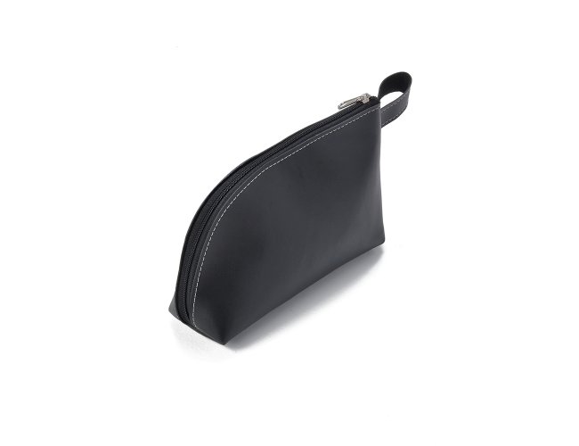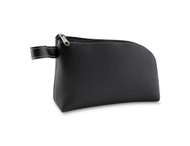 Necessaire em couro sintético preto com alça lateral. Gravação frontal na opções: serigrafia e plaquinha.