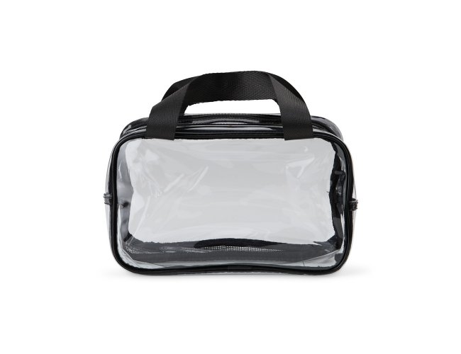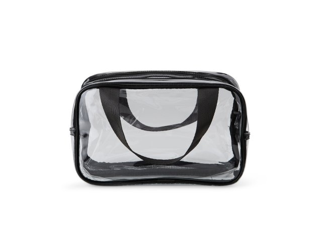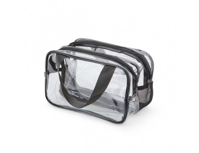 Nécessaire de PVC. Possui dois compartimentos e duas alças laterais de mão em nylon.