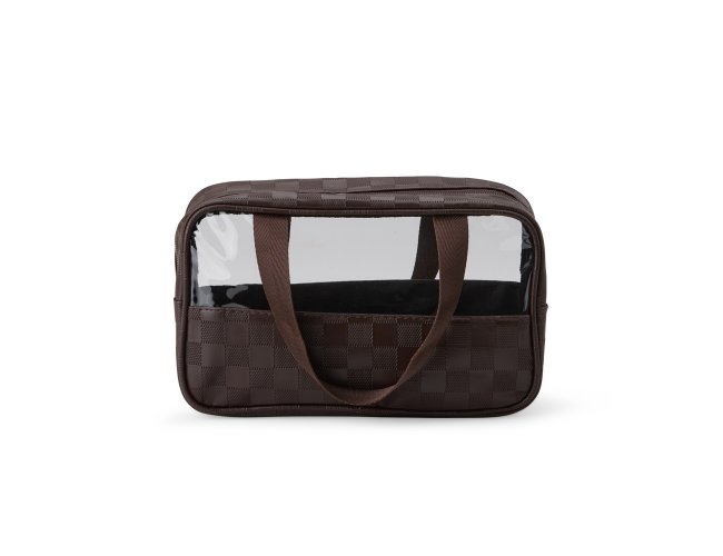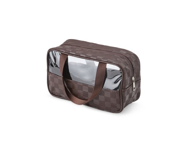 Nécessaire de PVC e couro sintético impermeável em xadrez . Possui visor transparente e duas alças laterais de mão em nylon.