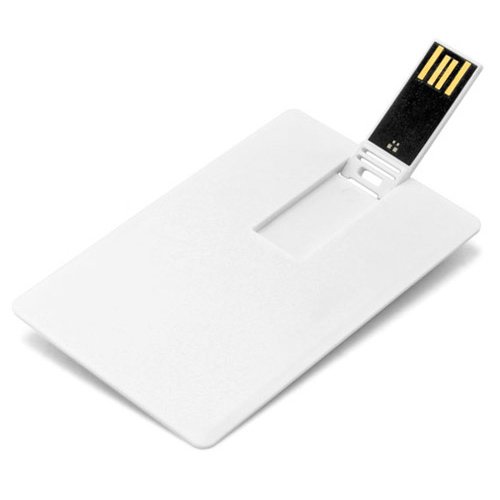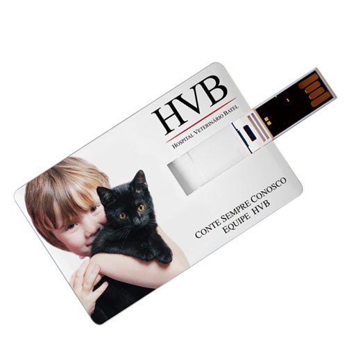 Pen drive formato cartão, material em plástico resistente, acabamento frontal liso e parte traseira com relevo do suporte. Personalizado com a sua logomarca.