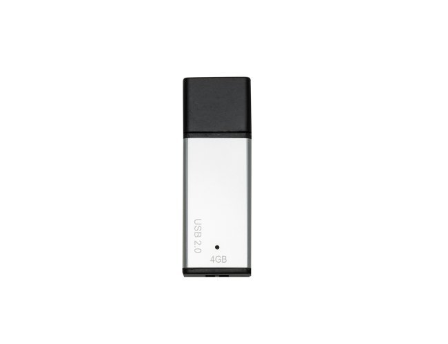 Pen drive retangular 8GB, material em metal e detalhes preto em plástico. Possui dois “furos” na parte inferior que poderá ser utilizado para colocar algum cordão(quando conectado uma luz vermelha acende neste local).