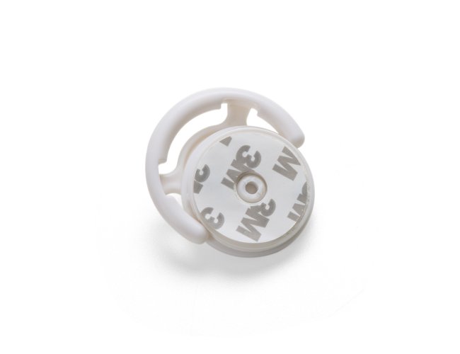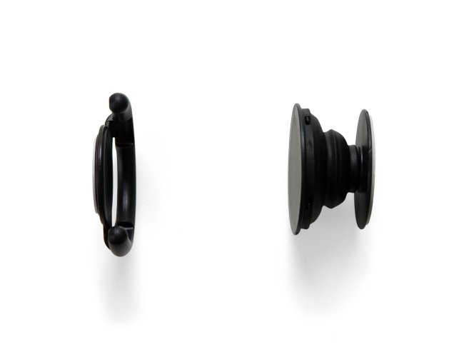 Suporte plástico para celular. Material plástico colorido, possui “disco” anelar retrátil que ao puxá-lo abrirá o encaixe para os dedos e possibilitará a rotação da peça. Base plástica para encaixe, pode ser colada no celular, paredes, vidros, ou onde desejar afim de que possa encaixar o suporte anelar. Suporte e base com adesivos, basta remover a proteção e colar no local desejado.