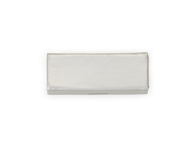 Porta batom em couro sintético prata com plaquinha de metal frontal com botão para abrir/fechar, possui um espelho interno.