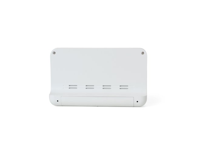 Relógio digital com alarme. Produzido em plástico, o relógio possui um display LCD com exibição das horas, dias da semana, data, alarme, relógio de contagem progressiva e regressiva, temperatura, clima e umidade, parte frontal inferior com botões para ajustes, e parte traseira com compartimento para 2 pilhas AAA (não acompanha). Acompanha manual de instruções em inglês