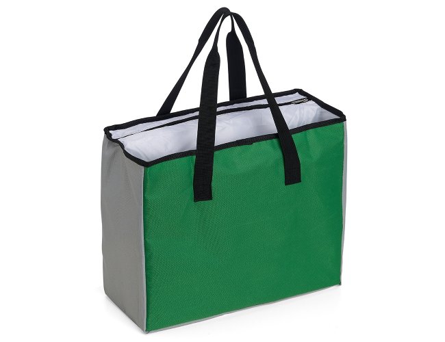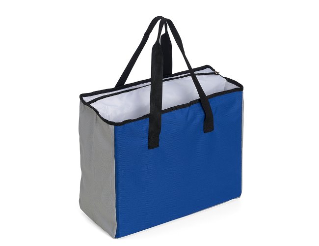 Sacola de poliéster com capacidade para 25 litros com bolso térmico. Contém um pequeno bolso interno de zíper e dois compartimentos principais, sendo um deles térmico e com fechamento de zíper.