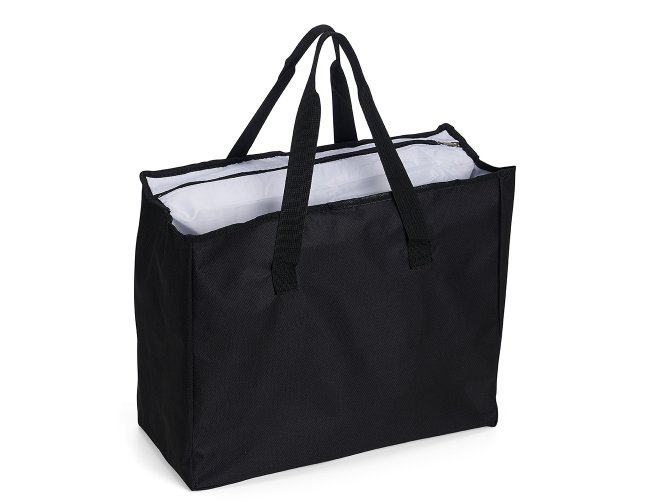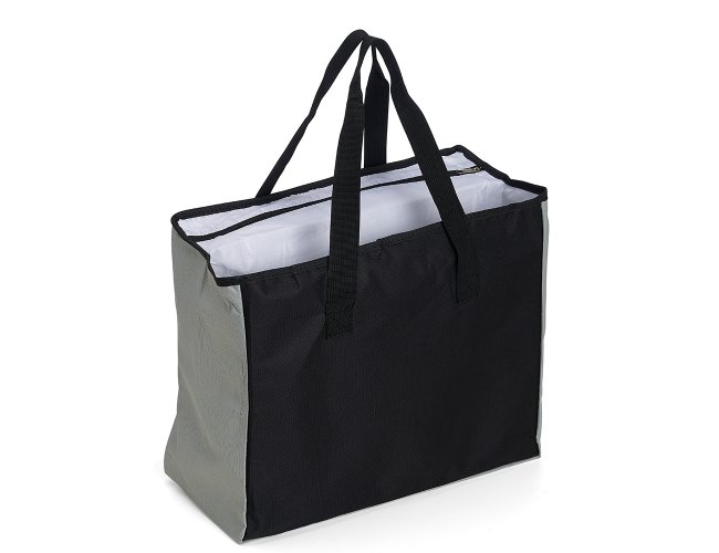 Sacola de poliéster com capacidade para 25 litros com bolso térmico. Contém um pequeno bolso interno de zíper e dois compartimentos principais, sendo um deles térmico e com fechamento de zíper.