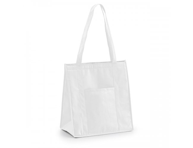 Sacola térmica. Non-woven: 80 g/m². Com fechamento em velcro e bolso frontal. Capacidade até 10 litros.