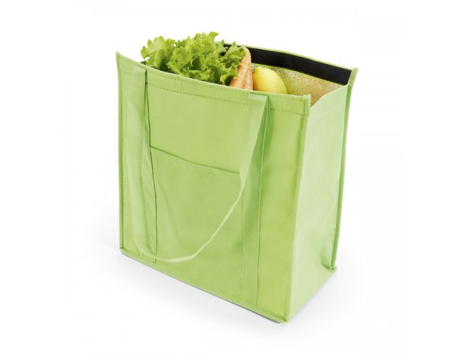 Sacola térmica. Non-woven: 80 g/m². Com fechamento em velcro e bolso frontal. Capacidade até 10 litros. Food grade.
