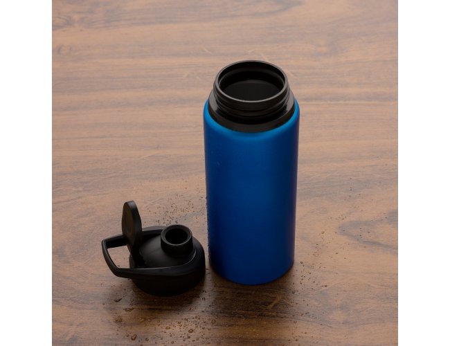 Squeeze alumínio de 600ml com pintura fosca. Squeeze com tampa plástica rosqueável, alça e tampa protetora para o bocal.
