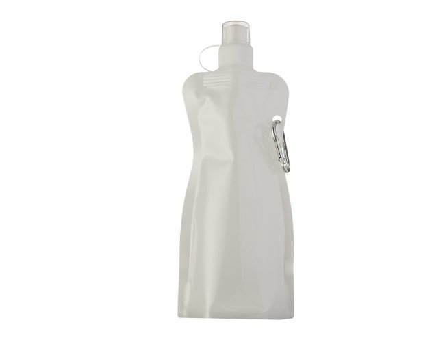 Squeeze dobrável de plástico com 480ml. Squeeze colorido acinturado com mosquetão superior de acordo com a cor do squeeze, possui tampa de bico texturizada e protetor plástico para o bico(com alça).