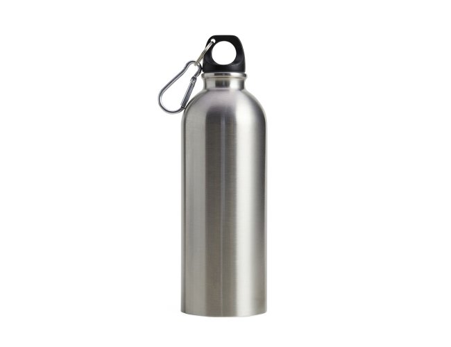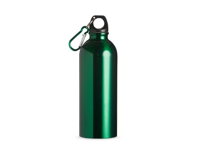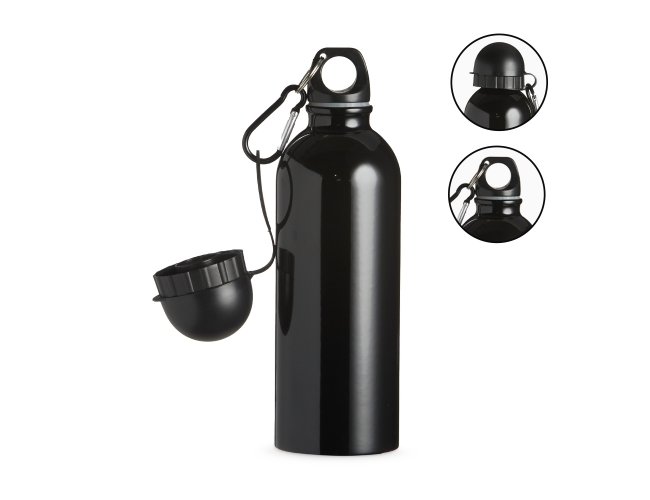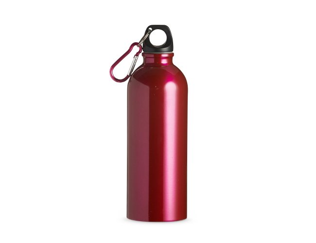 Squeeze 500ml de inox com pintura metalizada, tampa rosqueável e acompanha um segundo bico com mosquetão (não é térmico).