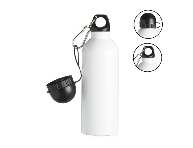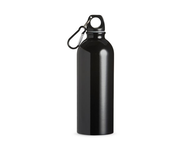 Squeeze 500ml de inox com pintura metalizada, tampa rosqueável e acompanha um segundo bico com mosquetão (não é térmico).