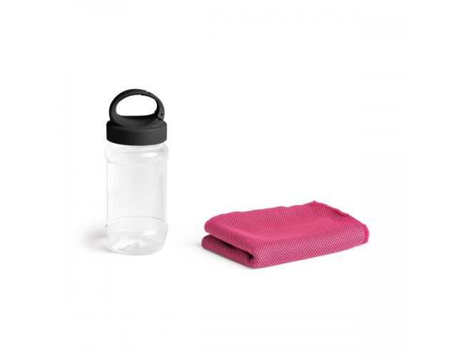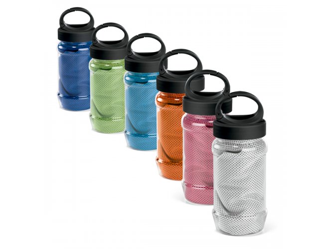 Toalha para esporte. Toalha: poliamida e poliéster. Garrafa: PP e PET. Toalha refrescante, quando molhada permanece fria durante horas. Se aquecer, basta balançar reativando sua frescura. Reutilizável e lavável à máquina. Garrafa com mosquetão inclusa (food grade). Capacidade até 440 ml. Toalha: 300 x 800 mm | Garrafa: ø65 x 125 mm